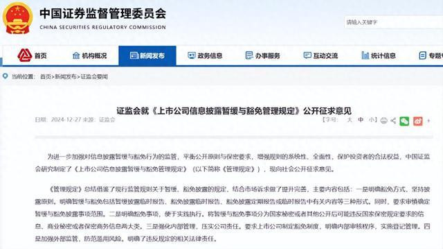 [群众网财经报说念记者陈十一]12月27日欧洲杯2024官网,中国证监会就《上市公司信息露馅暂缓与豁免治理章程》(以下简称《治理章程》)向社会公开征求成见,记号着我国上市公司信息露馅暂缓与豁免将有首个系统性步调文献。成见响应罢休时候为2025年1月26日。